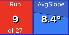 This double-section lets you know how many different activities SkiMax has determined you have performed during your day (here 27). A run can be either skiing, in or on a lift, or just simply resting. If the control button at the bottom is seleting ‘All Runs’ then the data reflects the total run-count. In this mode, the Avg Slope panel reports the average slope calculated from all SKI-runs. For this the lifts are not considered.