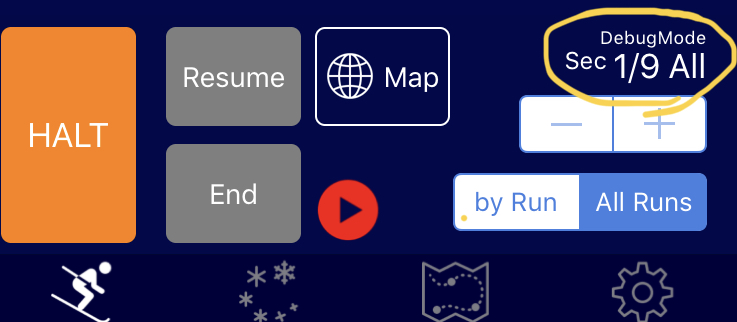 Debug mode is entered by tapping the ‘Longest Sustained Speed’ area, of the 'New Track', page ten times in succession within ten seconds. If successfully enabled the bottom tool-bar will display, in a small font size, the words: ‘DebugMode’, as shown below.